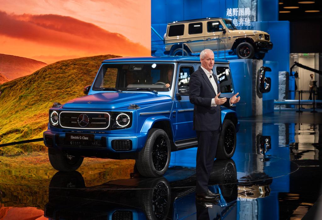 4月25日,在北京中国国际展览中心顺义馆举行的2024北京车展上,梅赛德斯—奔驰集团股份公司董事会成员唐仕凯介绍梅赛德斯—奔驰纯电G级越野车。