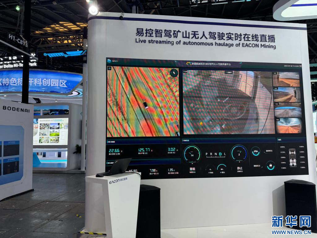 展厅的另一处,易控智驾正在实时直播国内一大型露天煤矿无人作业情况。现场工作人员介绍,在国家电投内蒙古公司南露天煤矿,自卸车无人驾驶运输项目已安全平稳地运行了半年多,不仅可进行24小时连续作业,还曾创下单日最高产量2.18万立方米的纪录。