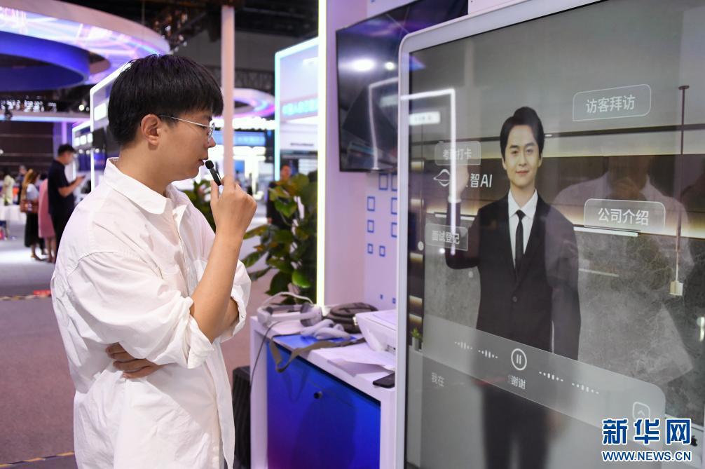 7月2日,工作人员在2024全球数字经济大会数字经济沉浸式体验区与数字人交流。