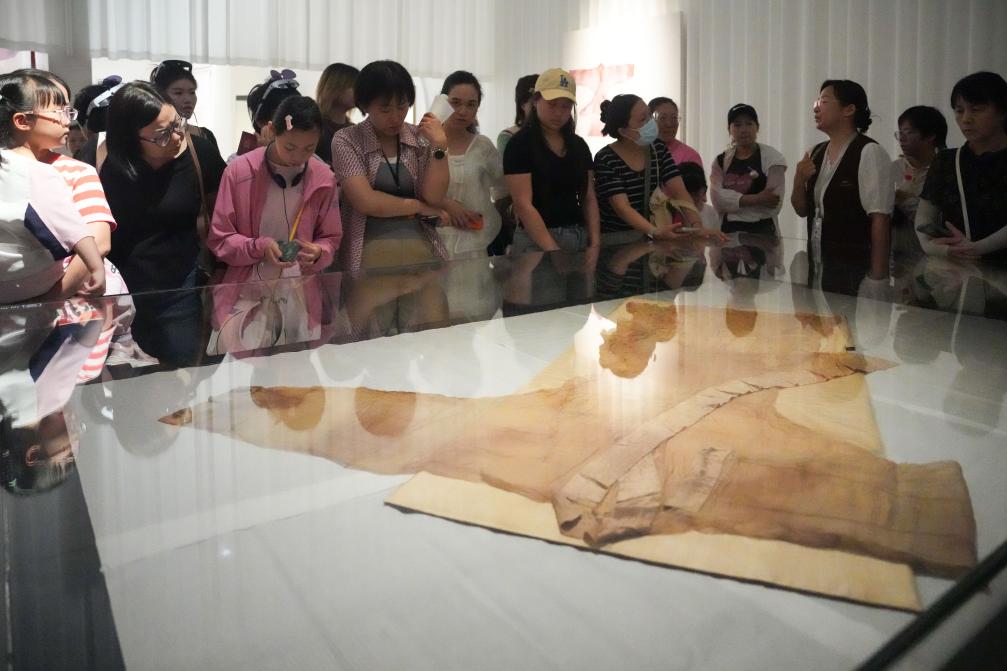 7月16日,观众在湖南博物院“彼美人兮——两汉罗马时期女性文物展”上观赏出土于马王堆汉墓的我国国宝级文物曲裾素纱单衣。