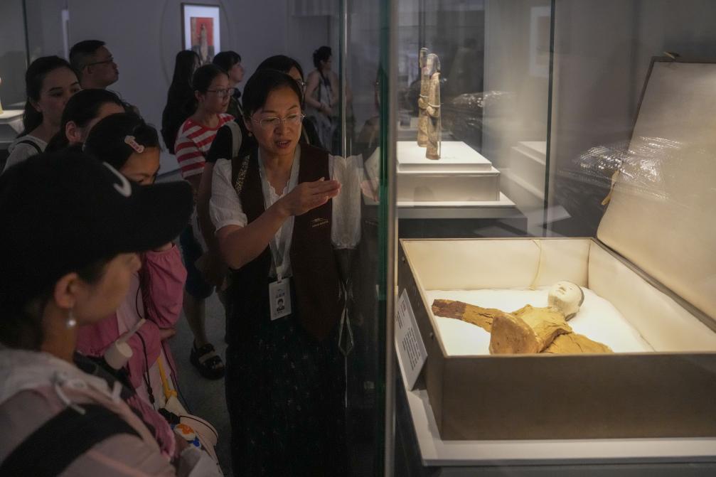 7月16日,志愿者(前右一)在湖南博物院为观众介绍“彼美人兮——两汉罗马时期女性文物展”。