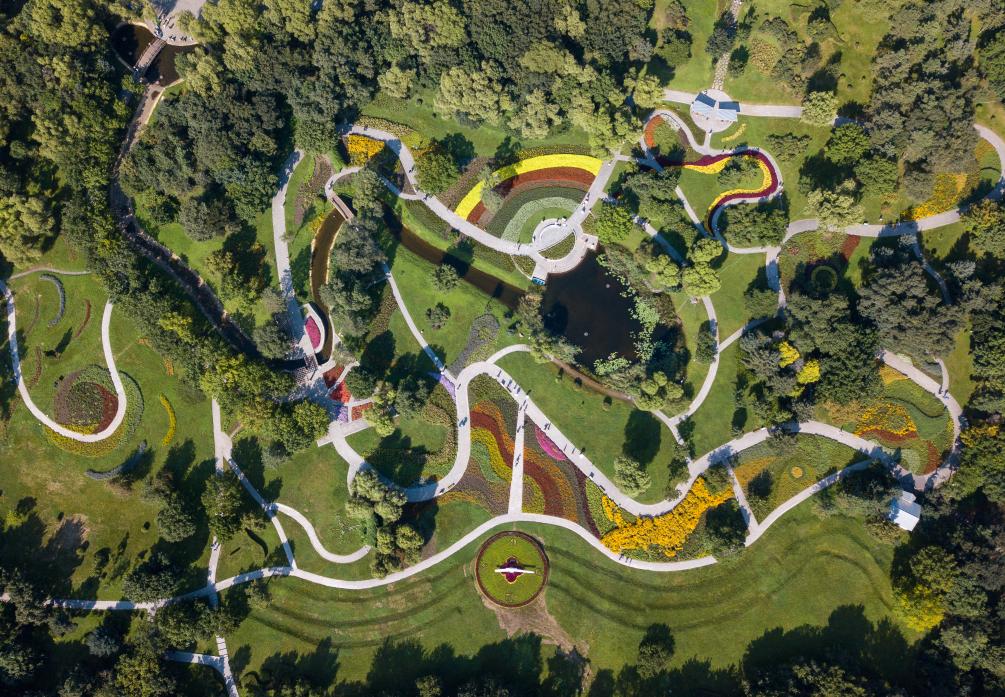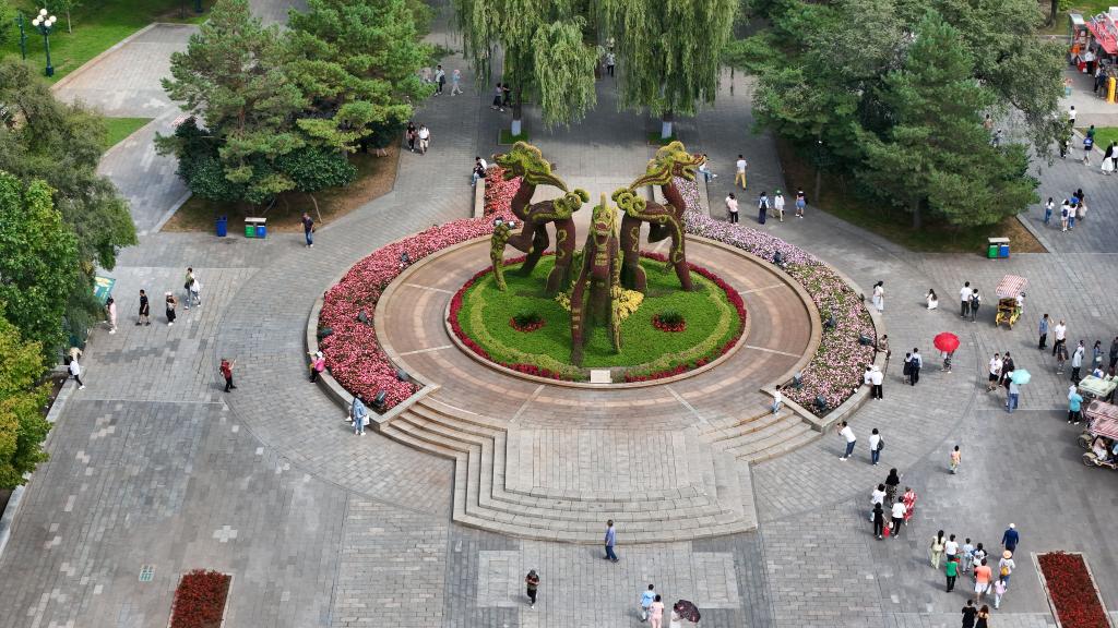 8月20日,游人在太阳岛风景区花卉园游览(无人机照片)。
