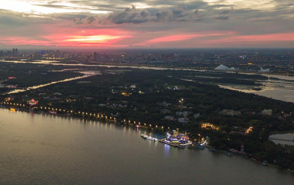 霞光下的太阳岛风景区景色(8月14日摄,无人机照片)。