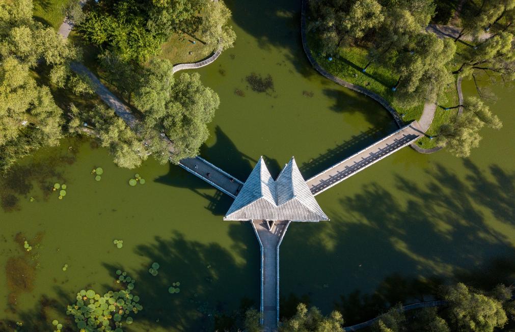 8月20日,游人在太阳岛风景区一处水上凉亭游览(无人机照片)。