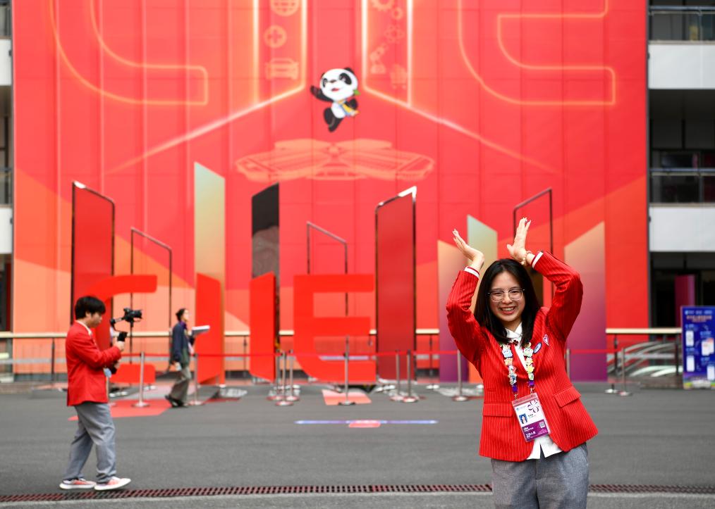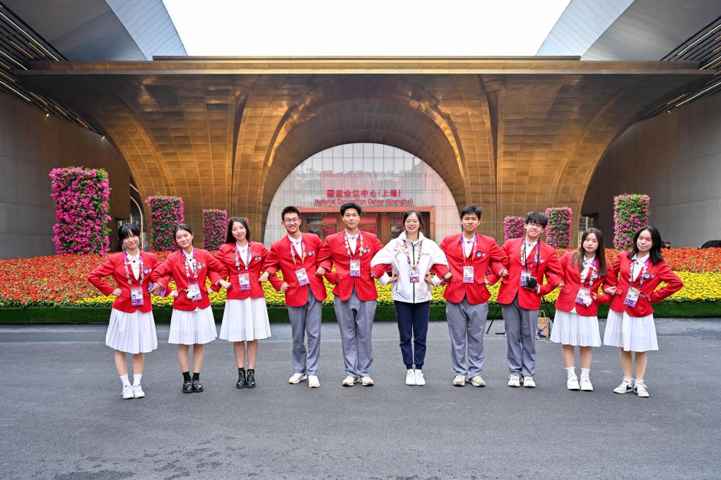 11月4日,志愿者在第七届中国国际进口博览会举办场地——国家会展中心(上海)留影。