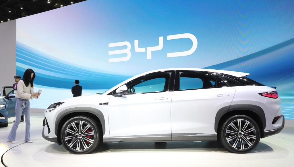 4月8日,在韩国京畿道高阳市,观众在“2025首尔移动出行展”上参观比亚迪展区。