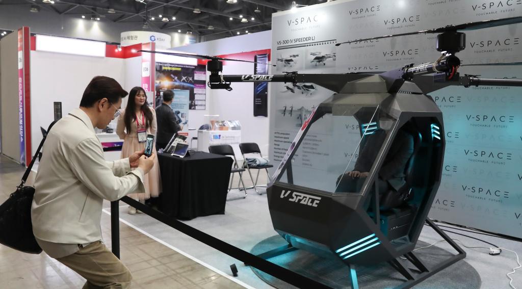 4月8日,在韩国京畿道高阳市,观众在“2025首尔移动出行展”上体验智能飞行器。