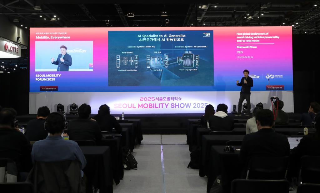 4月8日,在韩国京畿道高阳市,中国自动驾驶企业元戎启行CEO周光在“2025首尔移动出行展”上介绍智能驾驶。