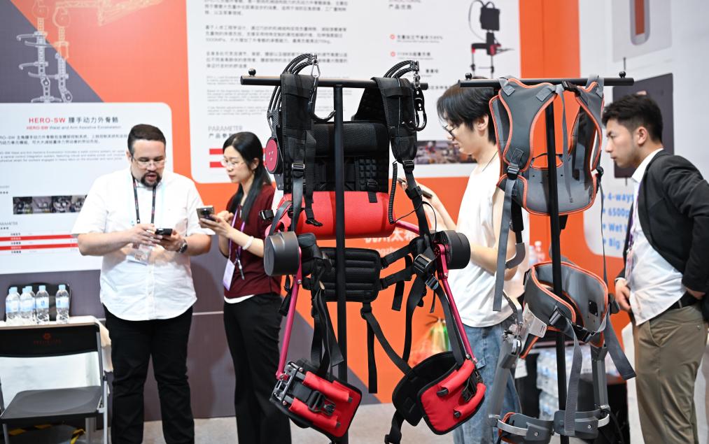 4月15日,在第137届广交会服务机器人专区,客商在智能工业外骨骼展区洽谈。