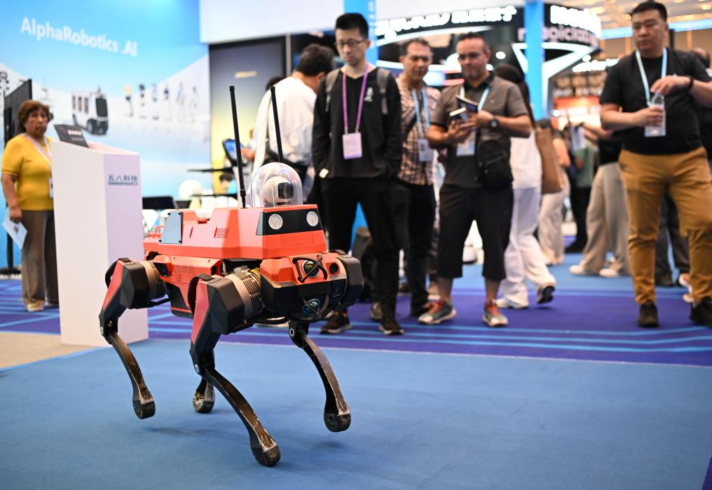 4月15日,在第137届广交会服务机器人专区,客商观看察打一体巡逻机器人。