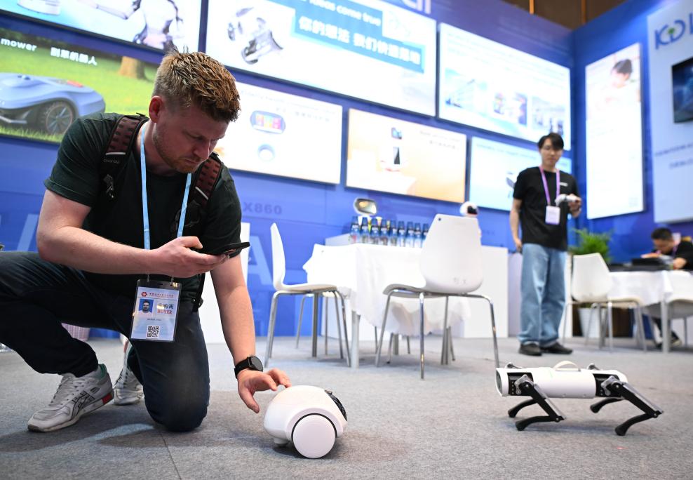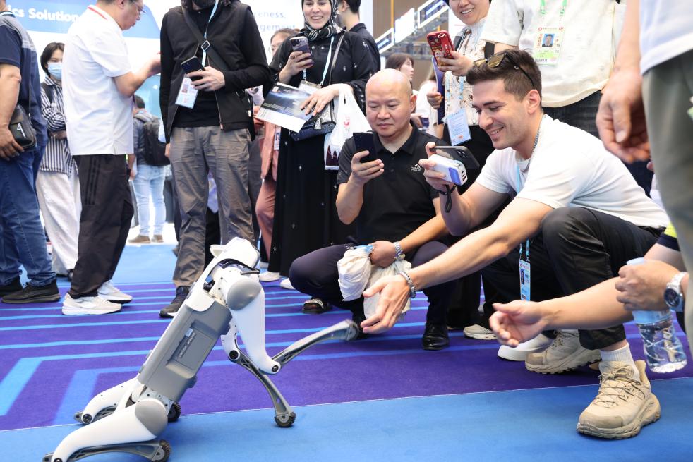 4月15日,在第137届广交会服务机器人专区,客商观看宠物机器人和教育机器人。