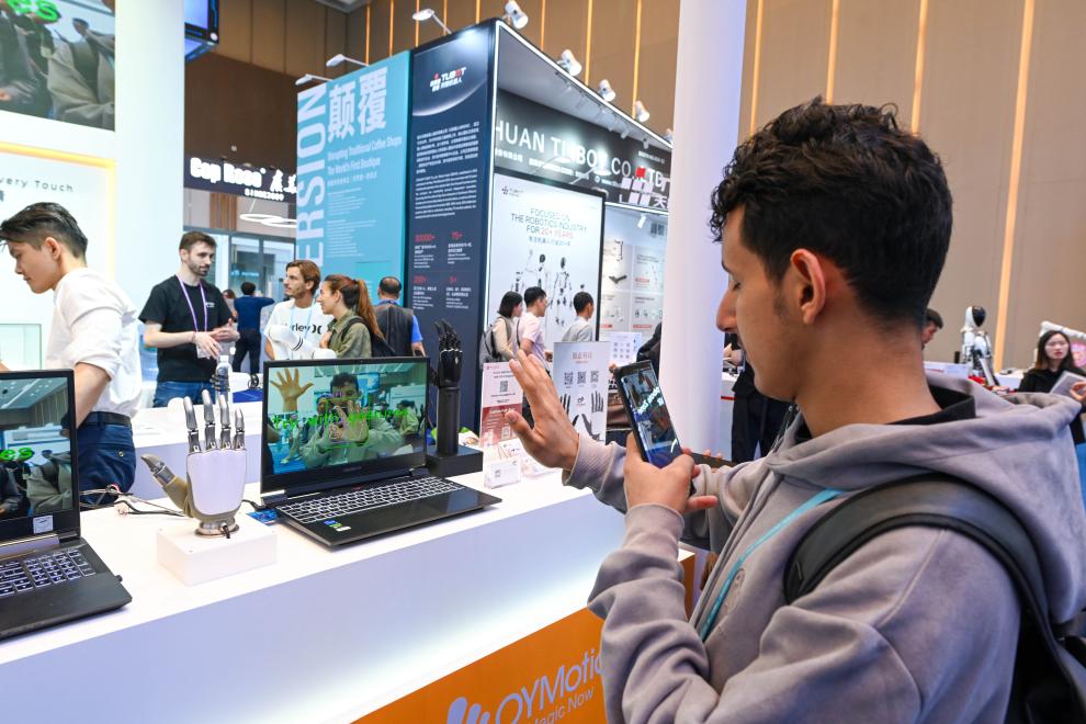 4月15日,在第137届广交会服务机器人专区,客商体验手势操控技术。