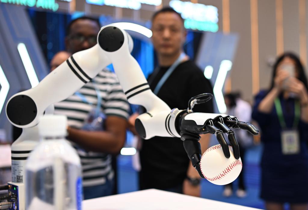 4月15日,在第137届广交会服务机器人专区,机械臂展示灵巧手功能。