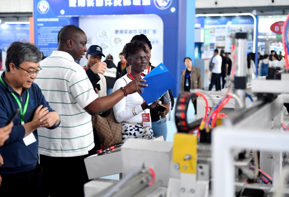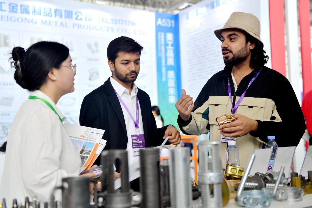 4月21日,国外采购商在2025永年紧固件产业博览会上参观。