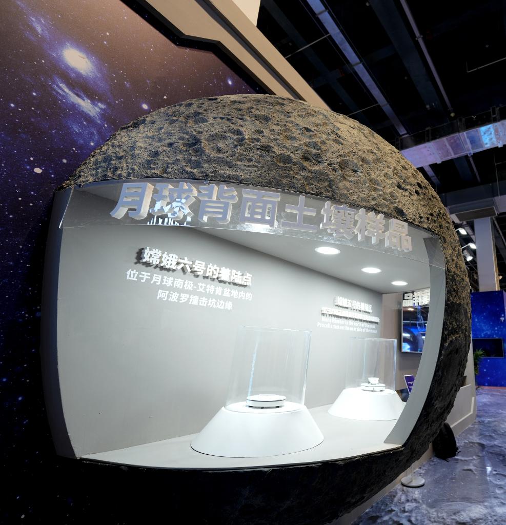 4月23日在2025年“中国航天日”科普展上拍摄的月球背面土壤样品展台。