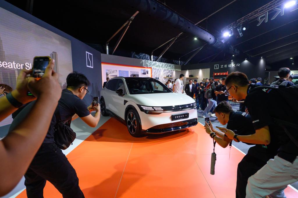 这是5月8日在马来西亚雪兰莪州沙登2025马来西亚车展媒体预览会上拍摄的极氪展台。