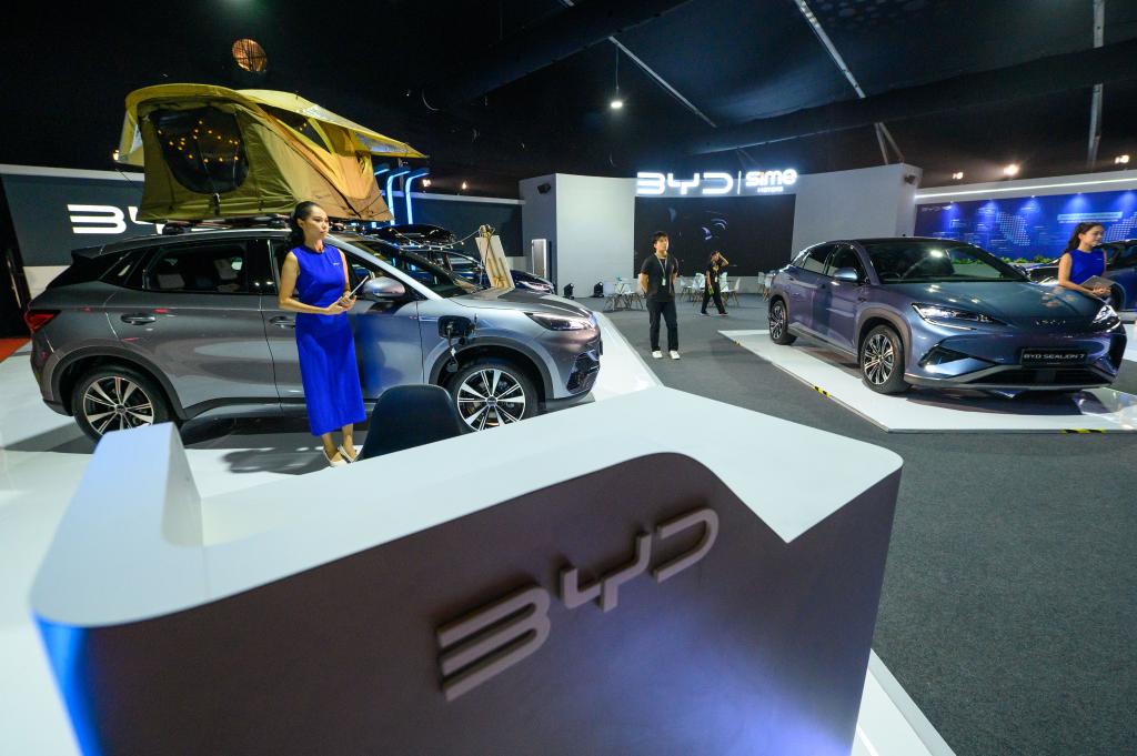 这是5月8日在马来西亚雪兰莪州沙登2025马来西亚车展媒体预览会上拍摄的比亚迪展台。