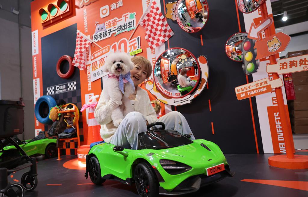 5月8日,一名参观者带着她的小狗在宠物出行展台上乘坐玩具车。