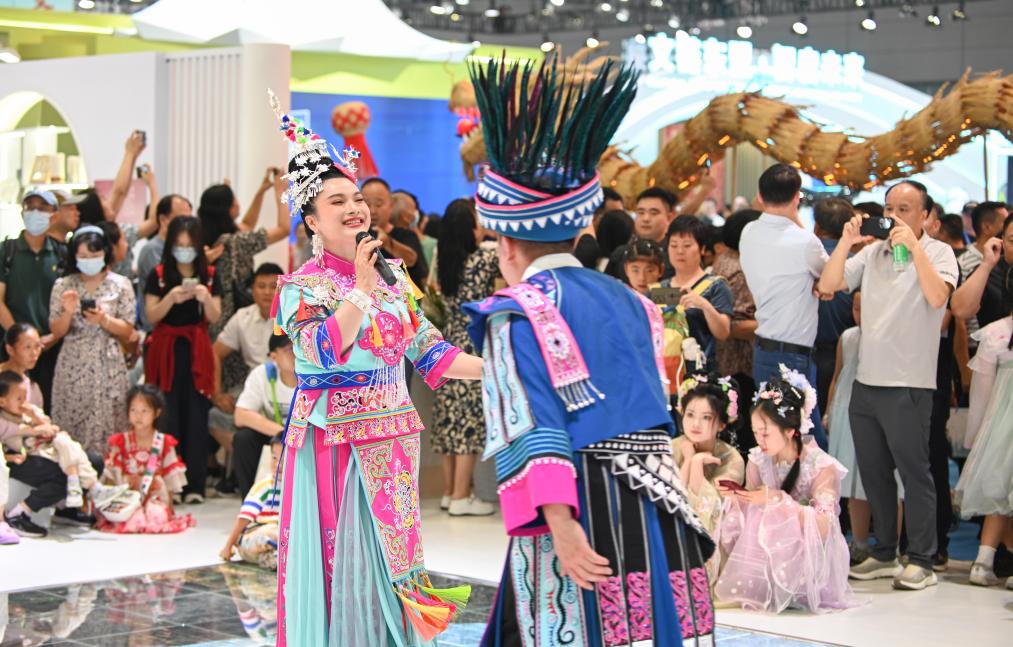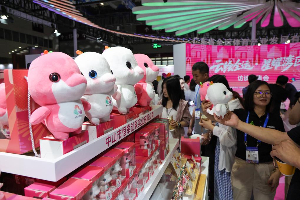 5月23日,观众在文博会现场选购第十五届全运会特许商品。