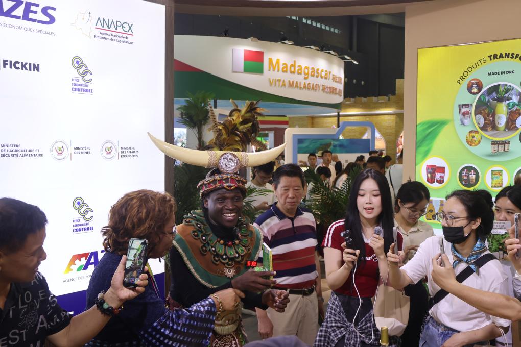 舞蹈方罢,直播登场。“朋友们看一看!刚果(金)的辣椒油棒极了!”望向刚果(金)展区,一位身着非洲传统服饰、头顶牛角的非洲小哥格外显眼。在他身前,陈列着刚果(金)的辣椒油、香蕉片、牛油果……人们手持拍摄设备记录下他与在场观众互动的珍贵瞬间。