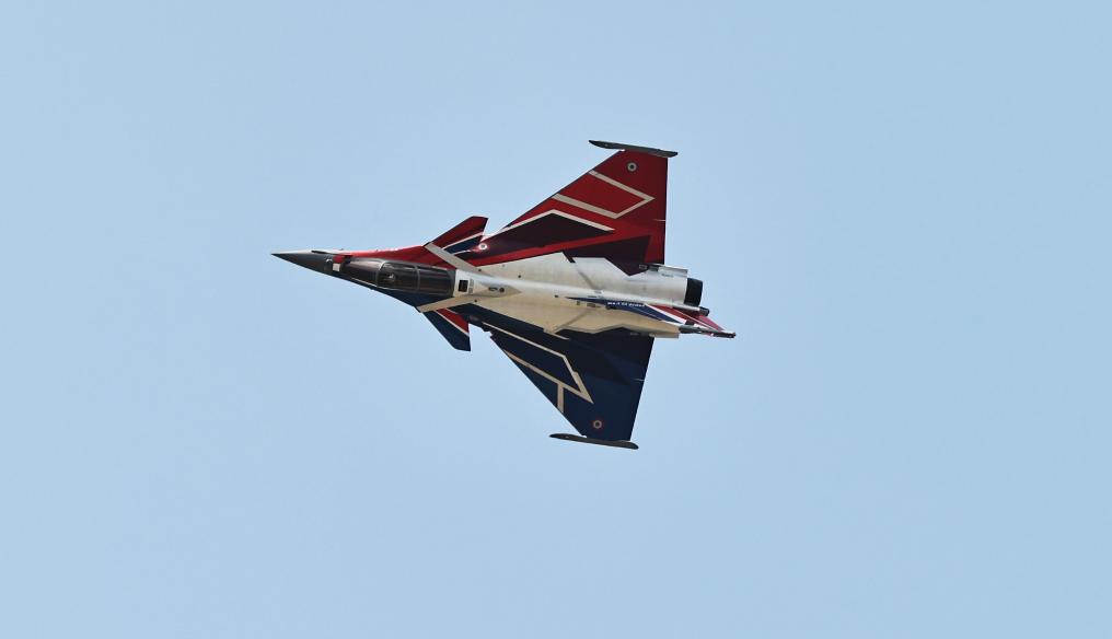 6月17日,在法国巴黎近郊布尔歇机场举行的第55届巴黎航展上,阵风战斗机进行飞行表演。