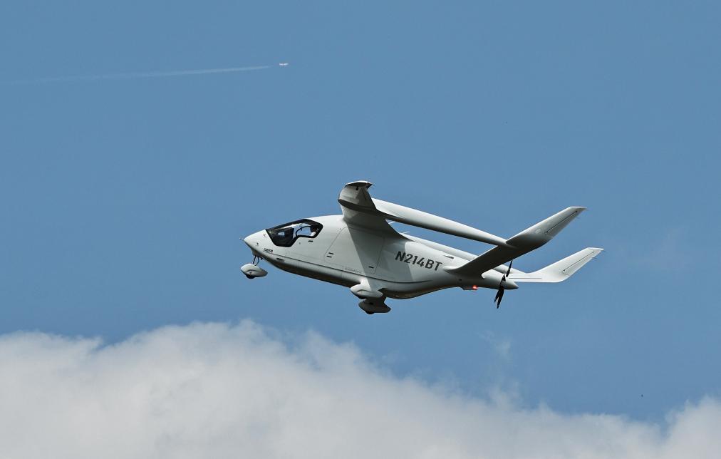 6月17日,在法国巴黎近郊布尔歇机场举行的第55届巴黎航展上,来自美国的BETA TECHNOLOGIES ALIA飞机进行飞行表演。