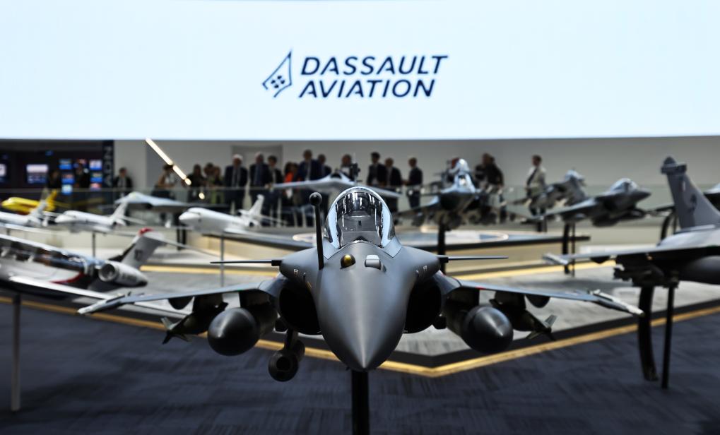 6月17日,在法国巴黎近郊布尔歇机场举行的第55届巴黎航展上,人们参观达索公司展区。