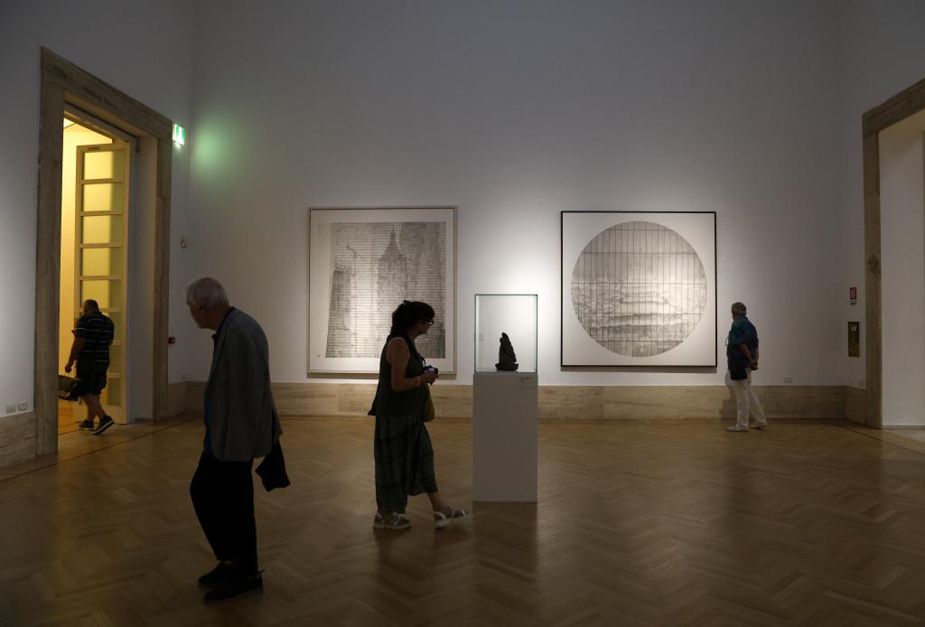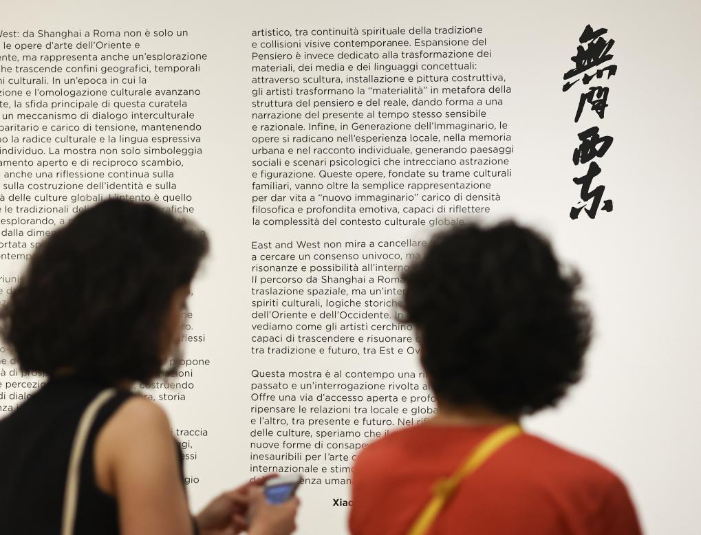 7月14日,参观者在意大利首都罗马观看“2025无问西东国际对话展:从上海到罗马”的展出作品。