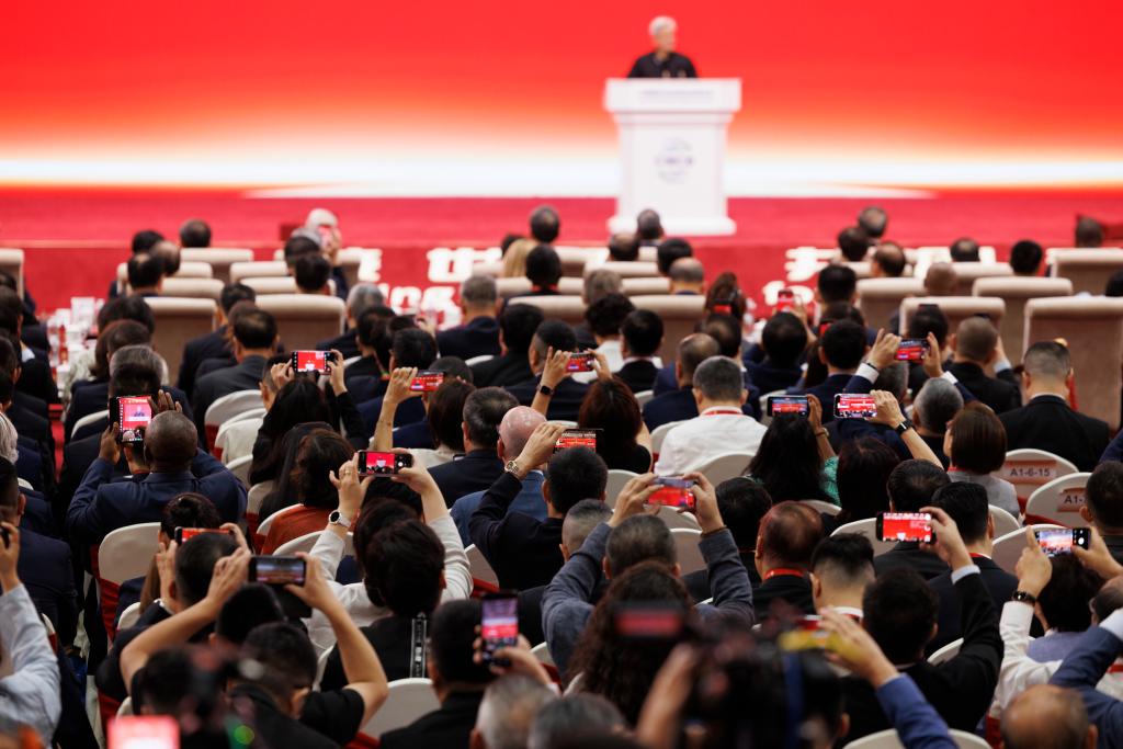 7月16日,媒体人员在第三届链博会开幕式现场用手机拍摄。