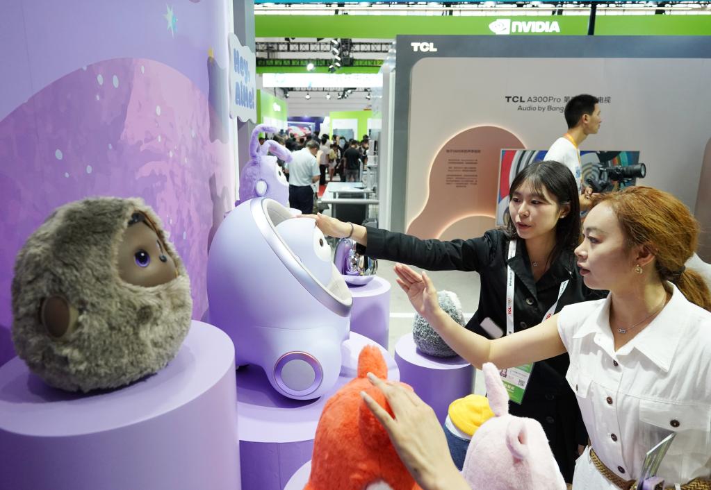 7月16日,观众们在数字科技链展区了解分体式陪伴机器人。