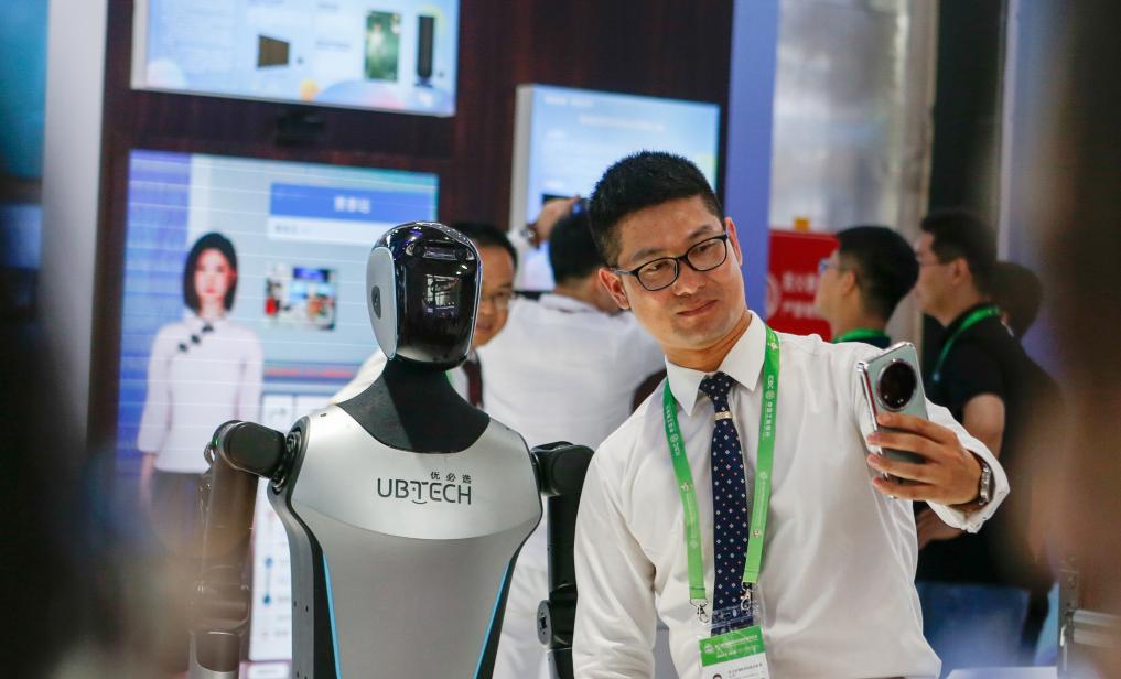 7月16日,参会者在智能汽车链展区与优必选人形机器人合影。