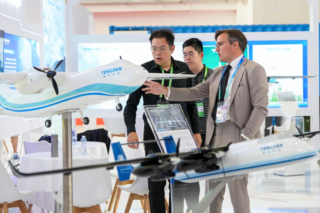 7月16日,参观者(右)在先进制造链展区腾盾科创展位了解无人机产品。