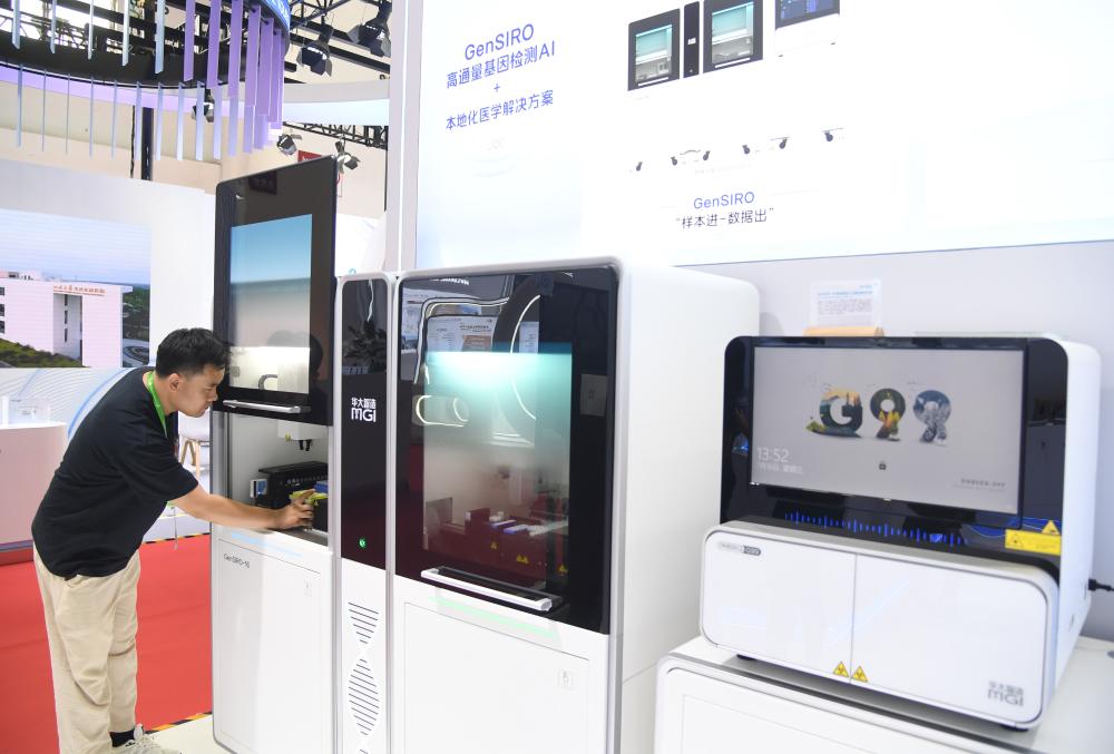 7月16日在健康生活链展区华大集团展位拍摄的高通量基因检测AI+本地化医学解决方案。