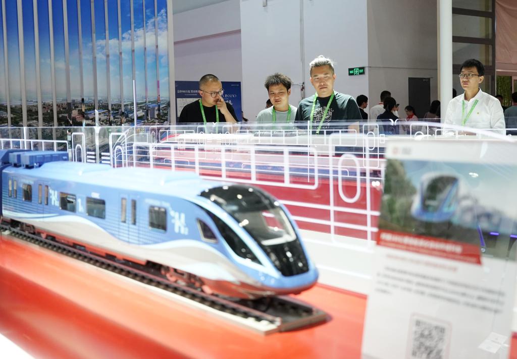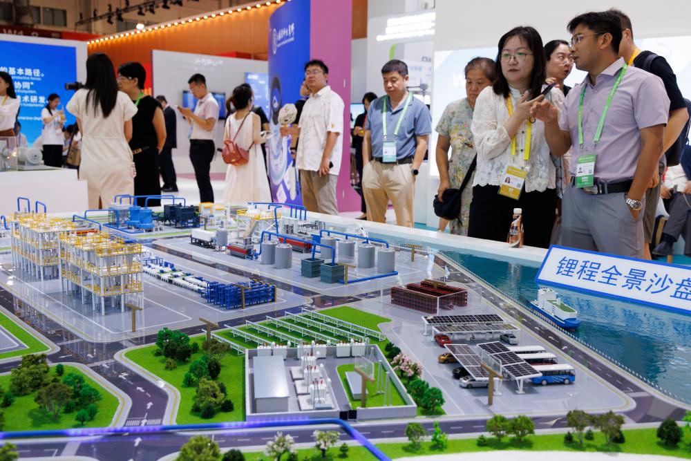 7月16日,在先进制造链展区创新链专区,观众参观展示锂电固体废料高效低碳处理技术与应用的全景沙盘。