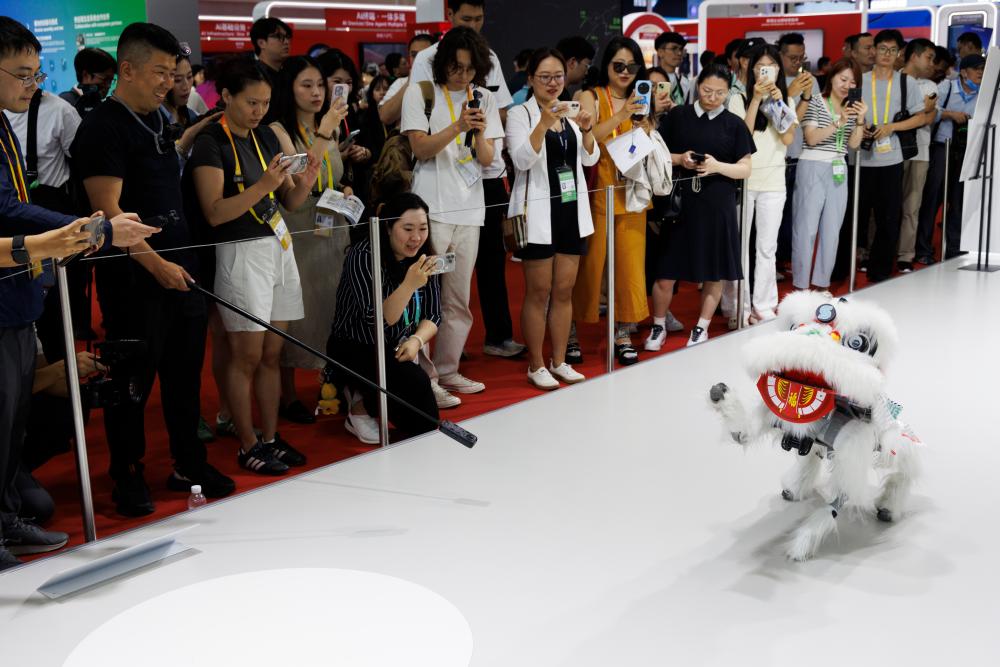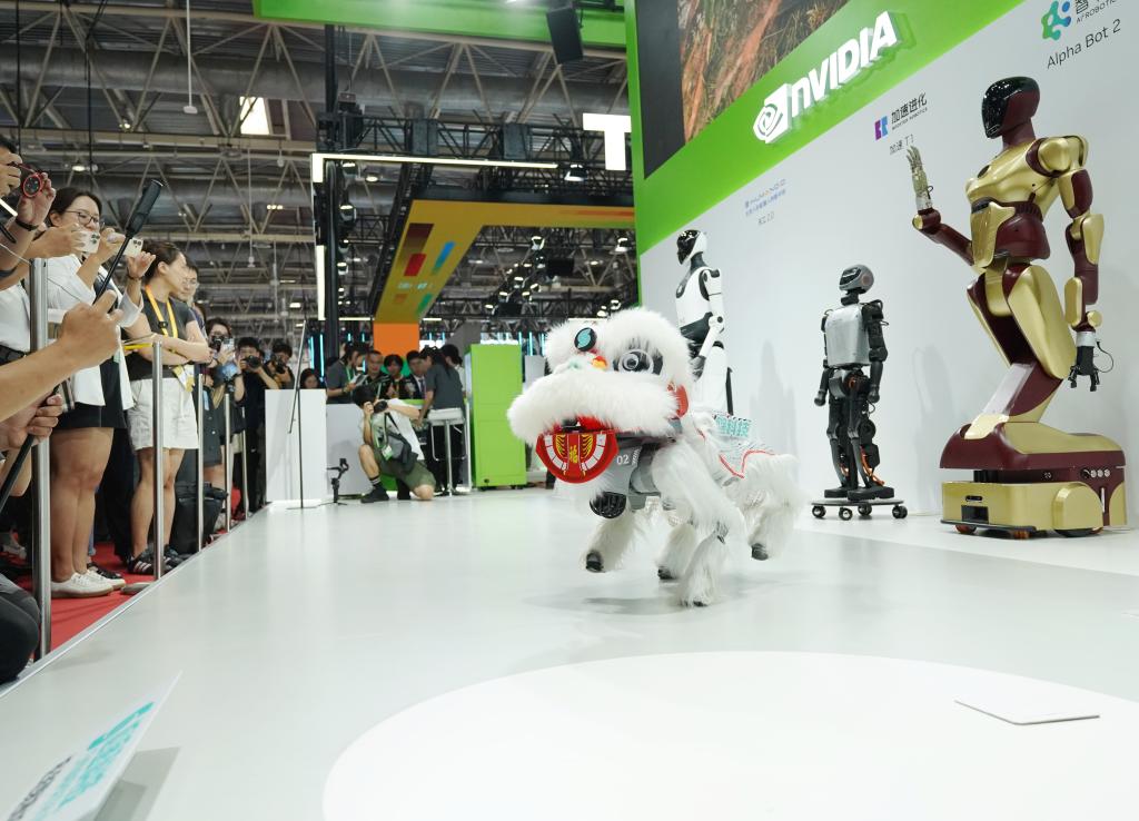 7月16日,观众在数字科技链展区参观一款“机器狮子”表演。