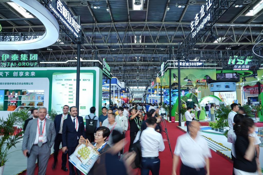 7月16日,人们在绿色农业链展区参观。