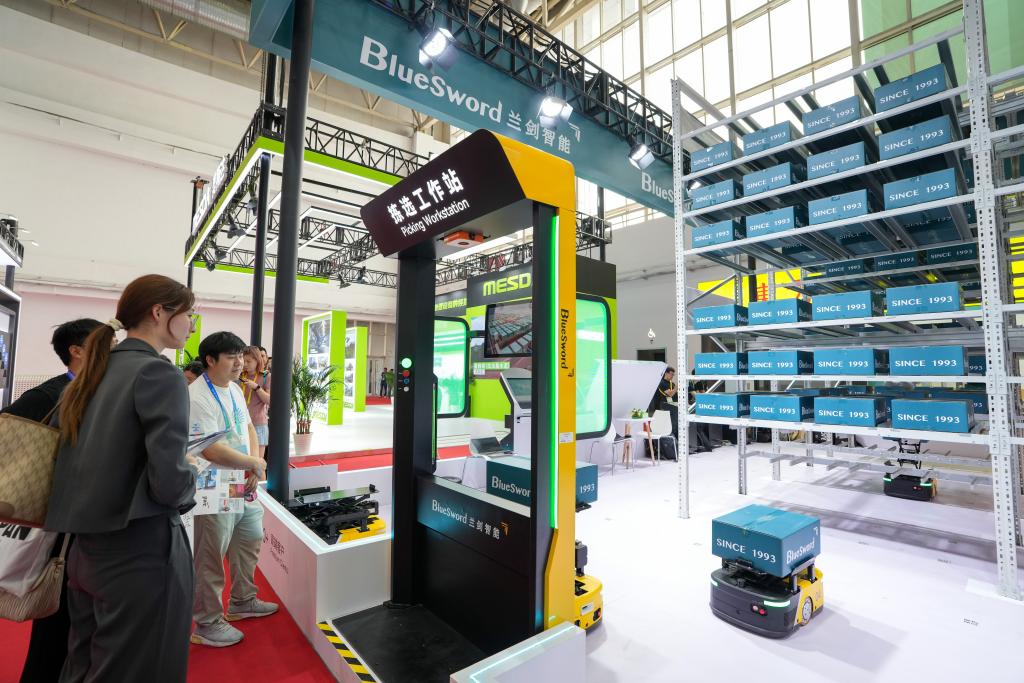 7月16日,参观者在先进制造链展区兰剑智能展台了解“蜘蛛侠悬挂式料箱机器人系统”。