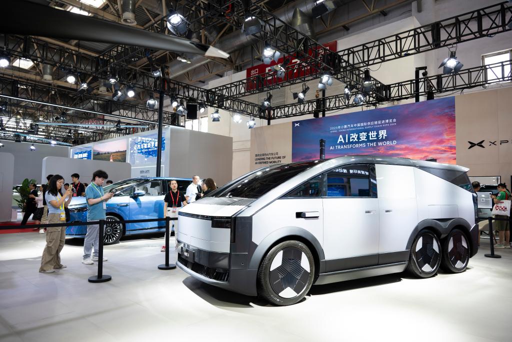 7月16日,参观者在智能汽车链展区了解一款小鹏汇天展车。