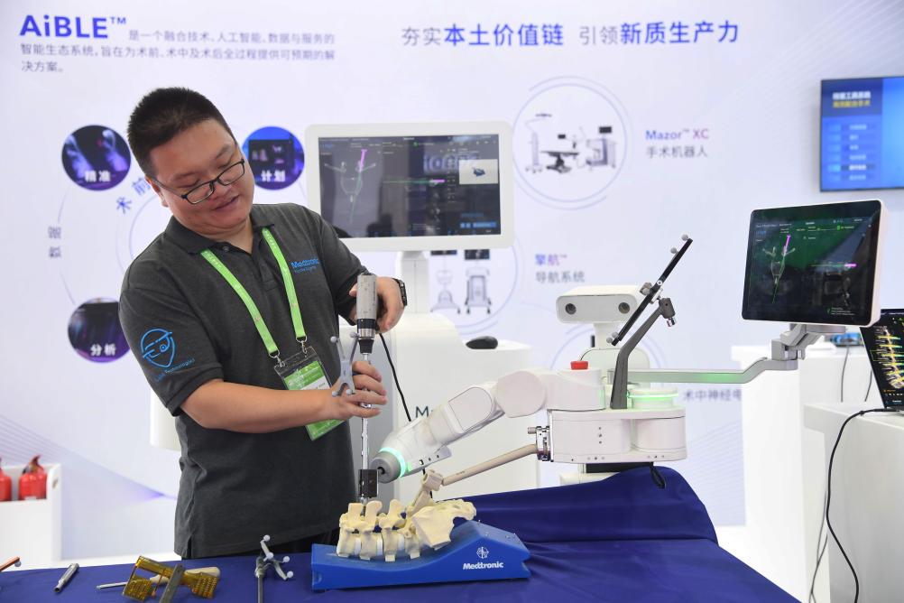 7月16日,工作人员在健康生活链展区展示一款骨科手术机器人。