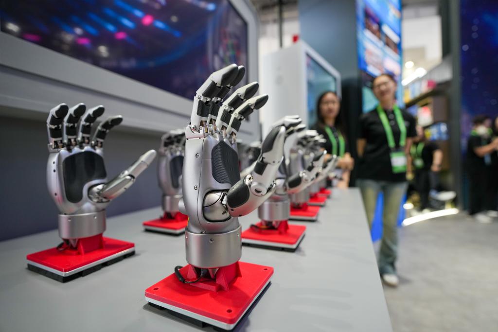 7月16日在先进制造链展区中信集团展台拍摄的机器手。