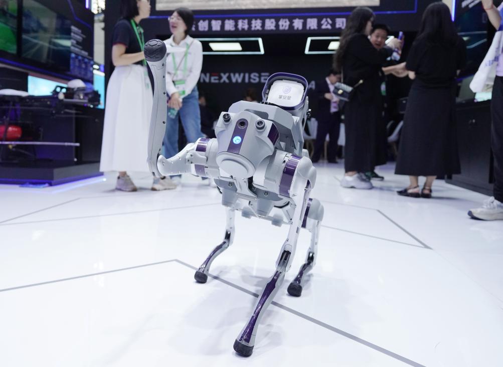 这是7月16日在数字科技链展区拍摄的电磁网捕巡防机器狗。