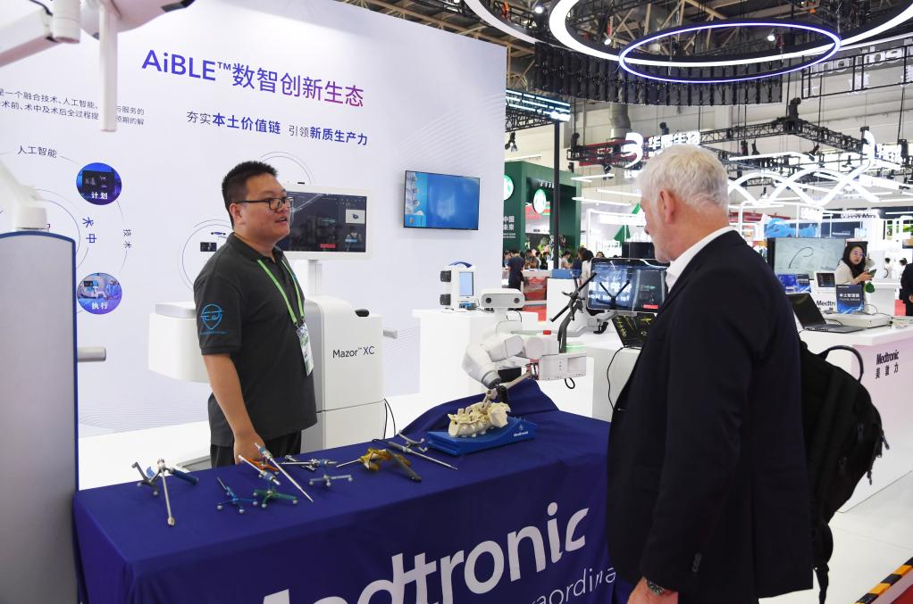 7月16日,工作人员(左)在健康生活链展区为观众介绍一款骨科手术机器人。
