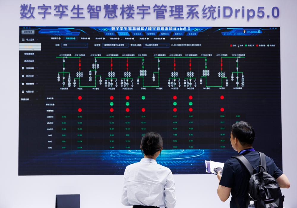 7月16日在清洁能源链展区拍摄的数字孪生智慧楼宇管理系统。