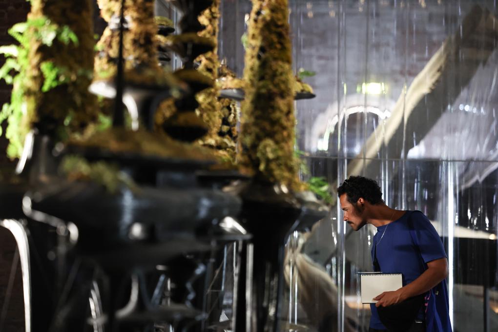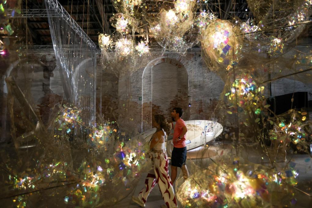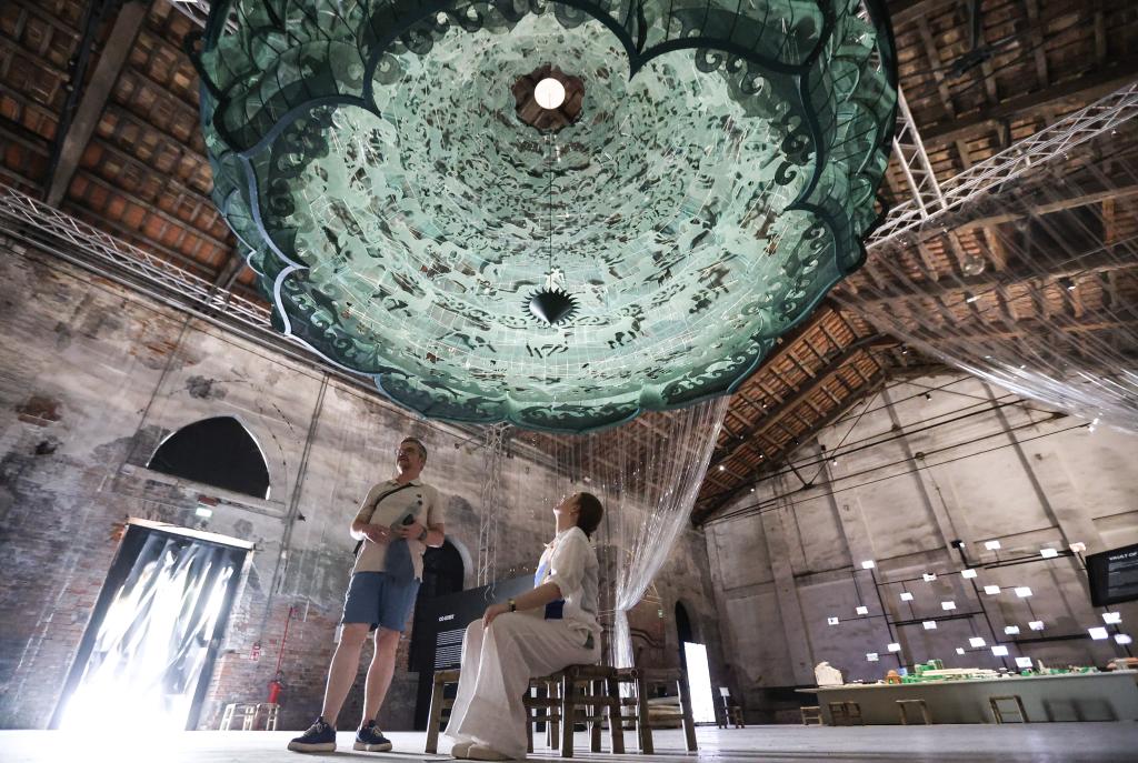7月16日,在意大利威尼斯,参观者在第19届威尼斯国际建筑双年展中国馆观看展品《苍穹》。