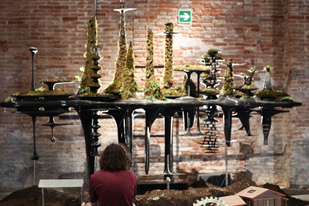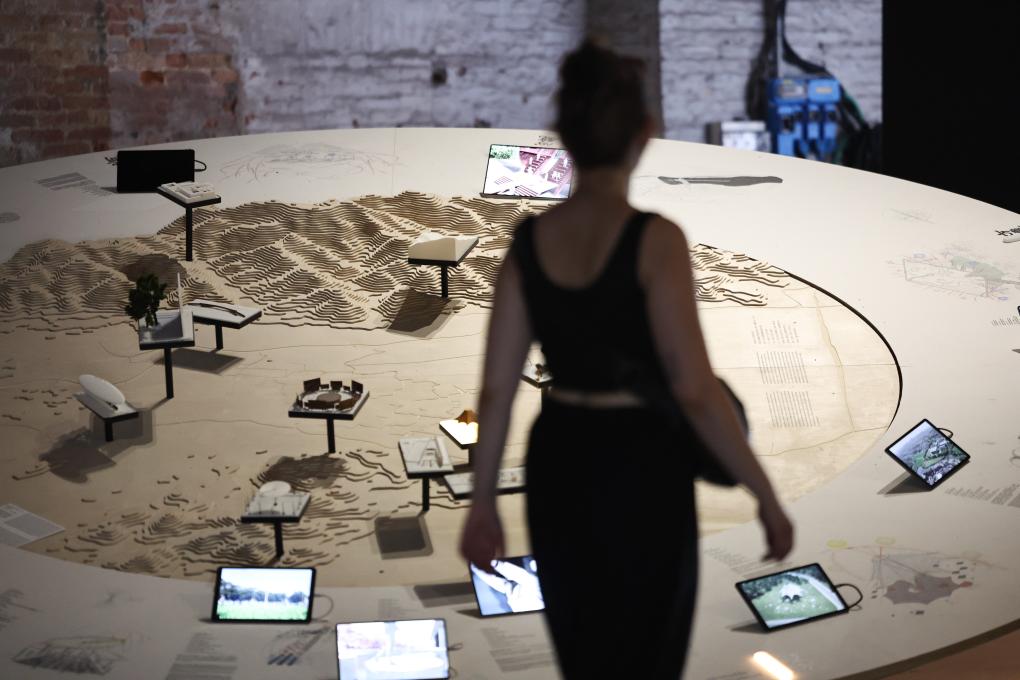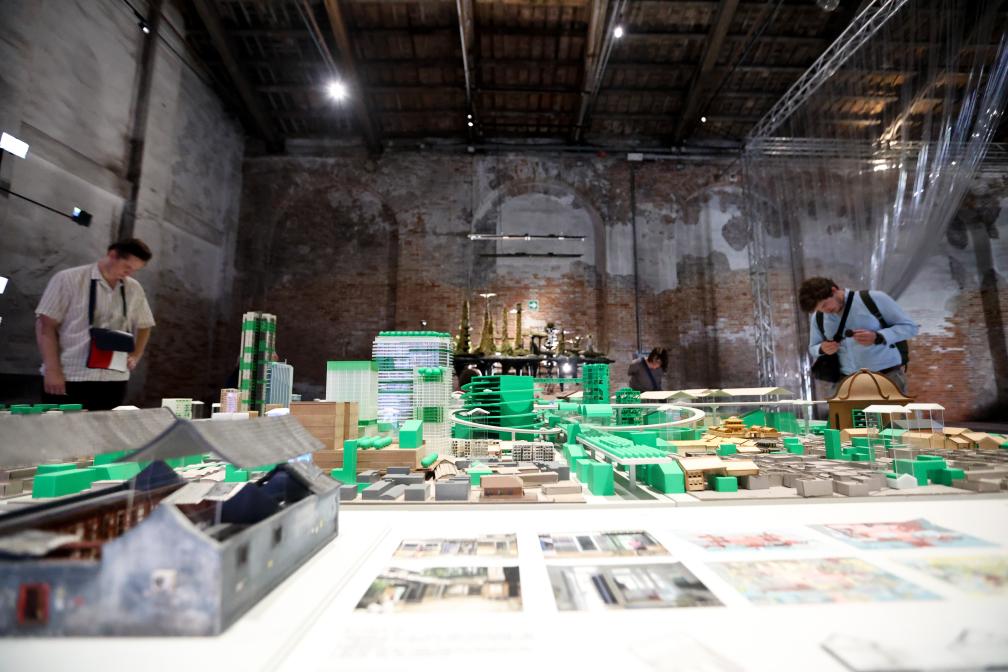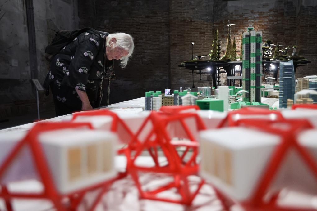 7月16日,在意大利威尼斯,参观者在第19届威尼斯国际建筑双年展中国馆观看展品《更新城》。