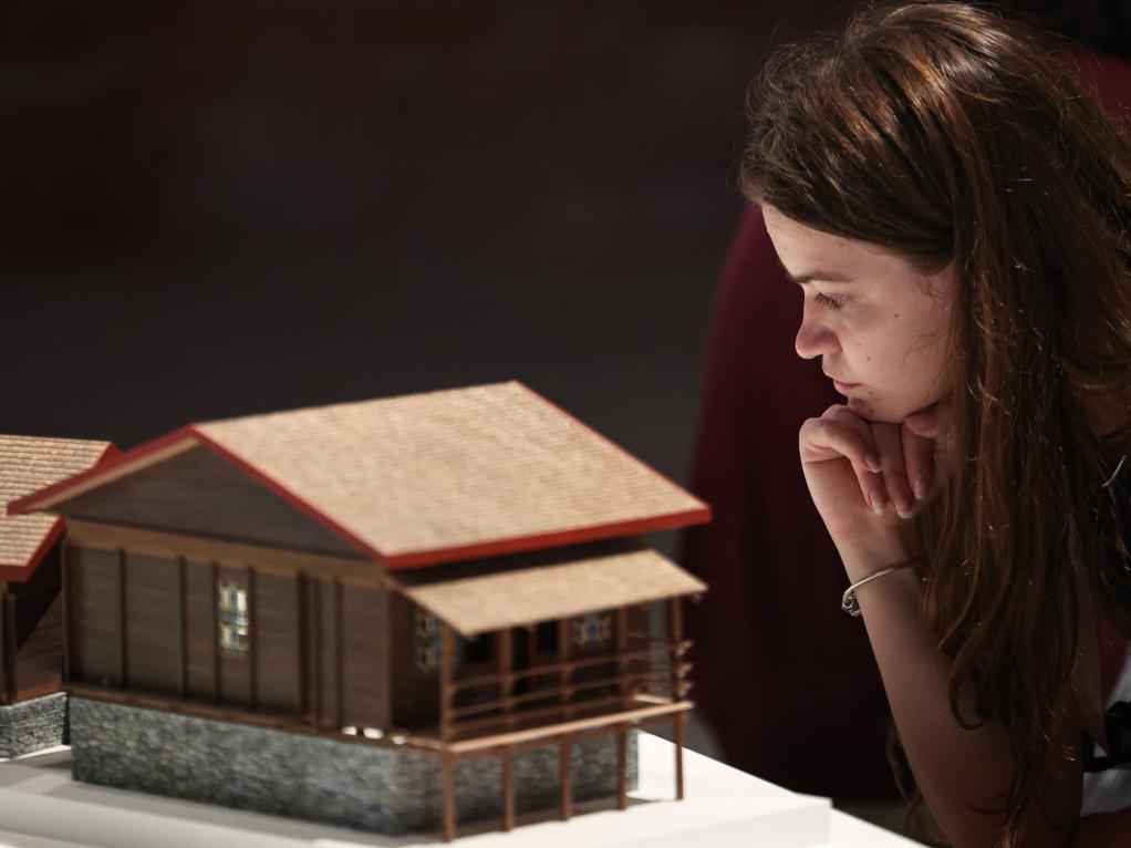 7月16日,在意大利威尼斯,一名参观者在第19届威尼斯国际建筑双年展中国馆观看展品《良渚十二律》。