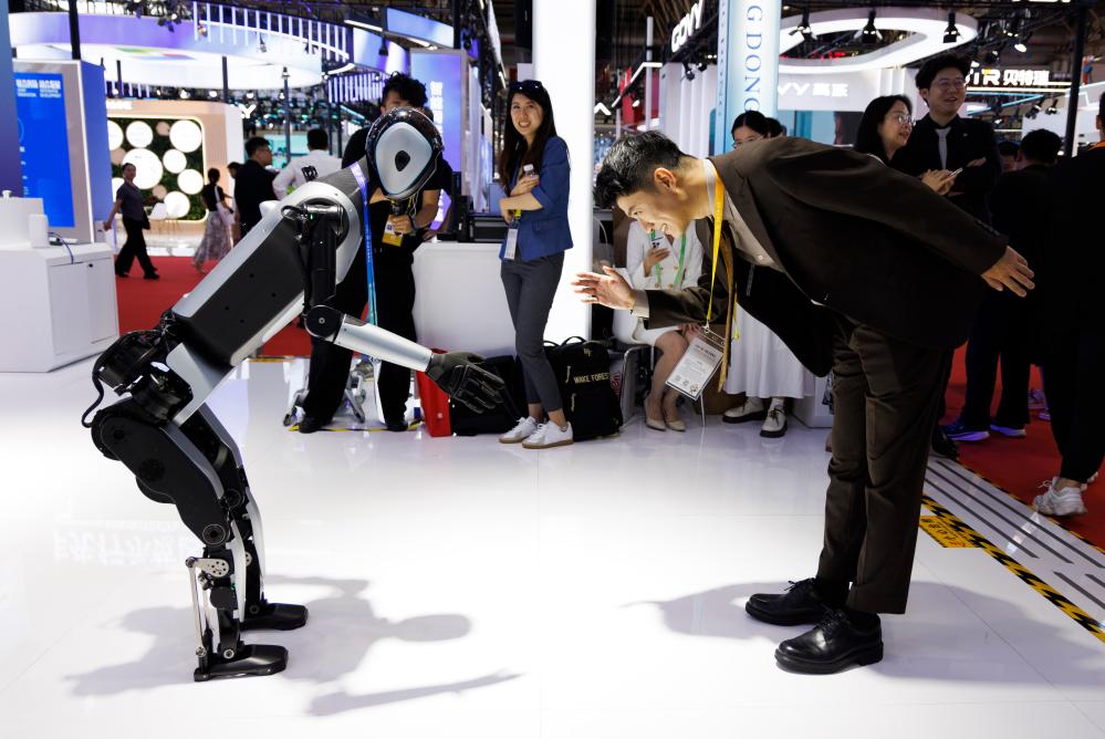 7月17日,在第三届中国国际供应链促进博览会主宾省广东省展台,商用版人形机器人“行者”和一位媒体记者互致问候。