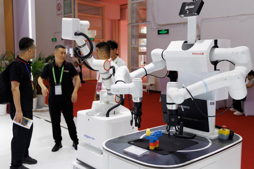 7月16日在第三届中国国际供应链促进博览会主宾省山东省展台拍摄的具身智能双臂机器人。