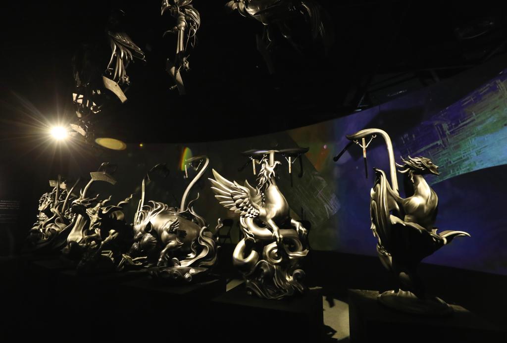 7月18日拍摄的展览上展出的陨石编磬“万籁寂”。全套编磬共计20片,架设在20个原创设计的中国上古神兽身上。