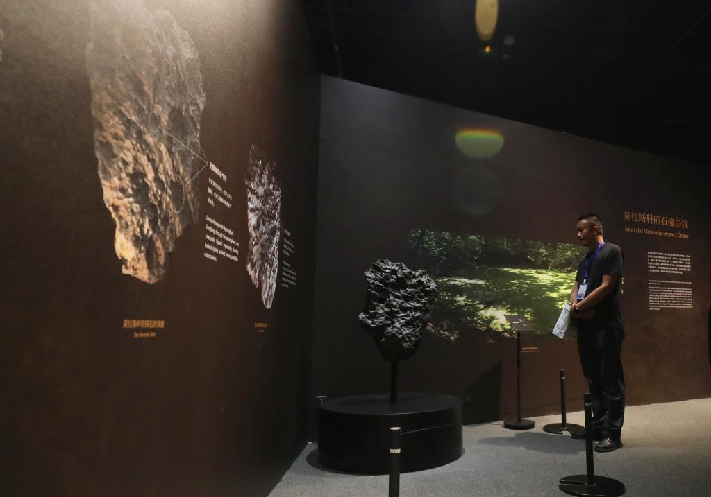 7月18日,一名参观者在莫拉斯科陨石展品前驻足观看。
